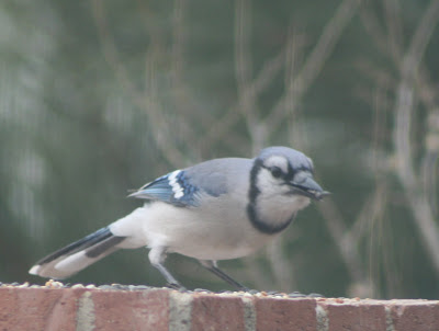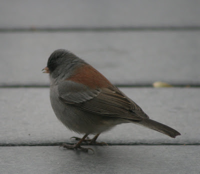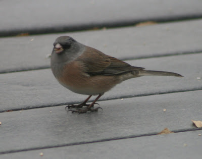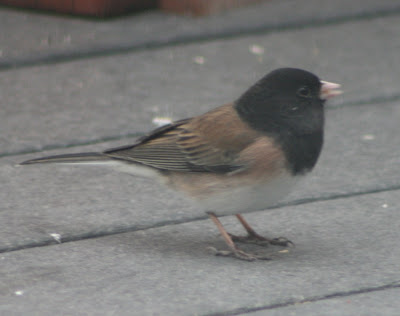 His distant cousin, a scrub jay, has also been hanging around today. We see them here from time to time, but their niche around here seems largely taken up by black-billed magpies.Also, today was the first arrival of dark-eyed juncos, who were here much earlier last year. For some emotional reason, I have been uncomfortable with the lumping of our common juncos into one species, but a mixed flock of three different races showed up today.