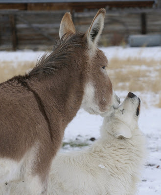 The dog and burro ended up standing there, with the dog leaning against the burro’s front legs for a few minutes, before the dog walked away and the burro went back to the fresh line of hay in the snow.