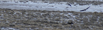 I felt better today, but had fallen behind on work, so today was spent at the computer all day. That is, until I heard Rena the Akbash raising hell, trying to jump over the yard fence to get out. I put her in the house so I could attempt to photograph the commotion. Someone had killed an antelope buck on the highway in front of the house, and four bald eagles and a few ravens had arrived for the feast.