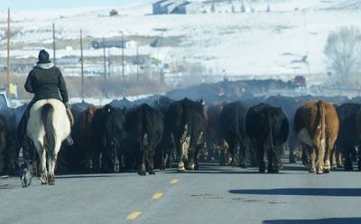 I had to make a run to the courthouse this morning, and met up with a traffic jam, prompting this entry. Let me provide a short etiquette lesson for cattle drive encounters. First and foremost, don’t get impatient and uptight when you see livestock being moved down a highway. Instead, get out the camera and take it easy for a few minutes to allow the herd to calmly proceed while you enjoy the glimpse of western life. These drives are not everyday occurrences, but are usually major movements to seasonal pastures.