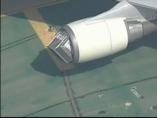 I was reminded of all this earlier this week, when the mother of all FOD incidents (see picture) occurred at LAX. A Japan Air Lines B747 sucked up a large metal baggage container. Who missed that on the FOD walk?