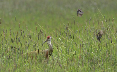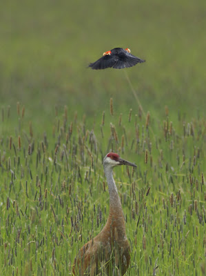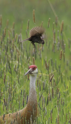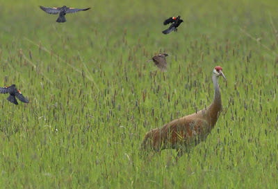 The crane, an adult male, ducked and twisted to get his head away from danger, but also attempted a few beak stabs at the more aggressive smaller birds. The crane hurried its stroll through the meadow, finally getting out of dangerous territory, and the blackbirds went back to their business. I do admire cranes, and now I have an added respect for the lowly blackbird as well.