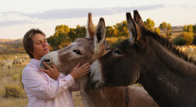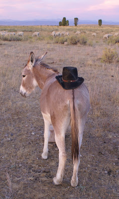 Every now and then, I need “glamour” photos to promote my appearances at book signings/festivals, so I turned the camera over to husband Jim last night. Since most of my books are for kids and are about animals, all my glamour shots involve critters as well. I like the photo posted above. Roo is the red burro, and the dark one with the beautiful eyes is Hillary. The marks on their necks are their freeze brands, since they were wild burros in Nevada that were removed from the range.