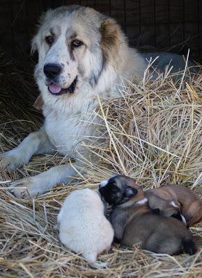 A few weeks ago, Vega gave birth to puppies underneath a sheep camp out in the wide sagebrush of western Wyoming. She became fierce to anyone coming near the camp, and the temperatures started to get extremely cold at night, so last night my friend Pete braved the weather and her wrath enough to physically pick Vega up and throw her into the cab of his truck , along with her three puppies. He dropped the dog family off in my kennel last night, and here’s the happy group in the morning sunshine.