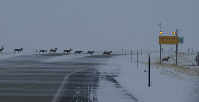When a winter storm hit Tuesday morning, mule deer came pouring down the migration trail from the mountains, crossing what has become a very famous migration bottleneck, Trapper’s Point outside of Pinedale, Wyoming. Here’s a group of deer traversing the bottleneck between two rivers and crossing U.S. Highway 191. It is -32 degrees this morning at the ranch – not fit for man nor beast. I’m looking forward to Saturday’s predicted snowfall, so we’ll have highs of nearly 30 above zero. Sounds wonderful. Sixty degrees warmer than currently.