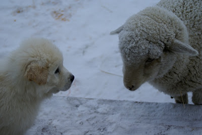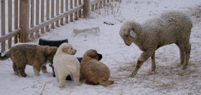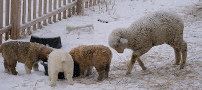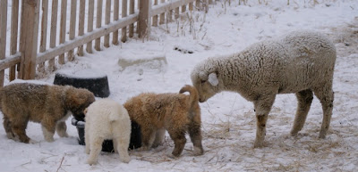 1. Since they are all children, I'm not sure a full lesson has been learned yet. The pups get butted when they aren't nice to the lambs, or when they are into something they shouldn't be (like the oat pan). But one of the pups, Mikey, has started lunging back at the big lamb that likes to knock him down, making her behave as well. Everyone has to learn the consequences of not being nice to each other, and for these little ones, it can take a while (since there are no adults to supervise). None of them are ever seriously hurt, and they eventually bed down together and become bonded.