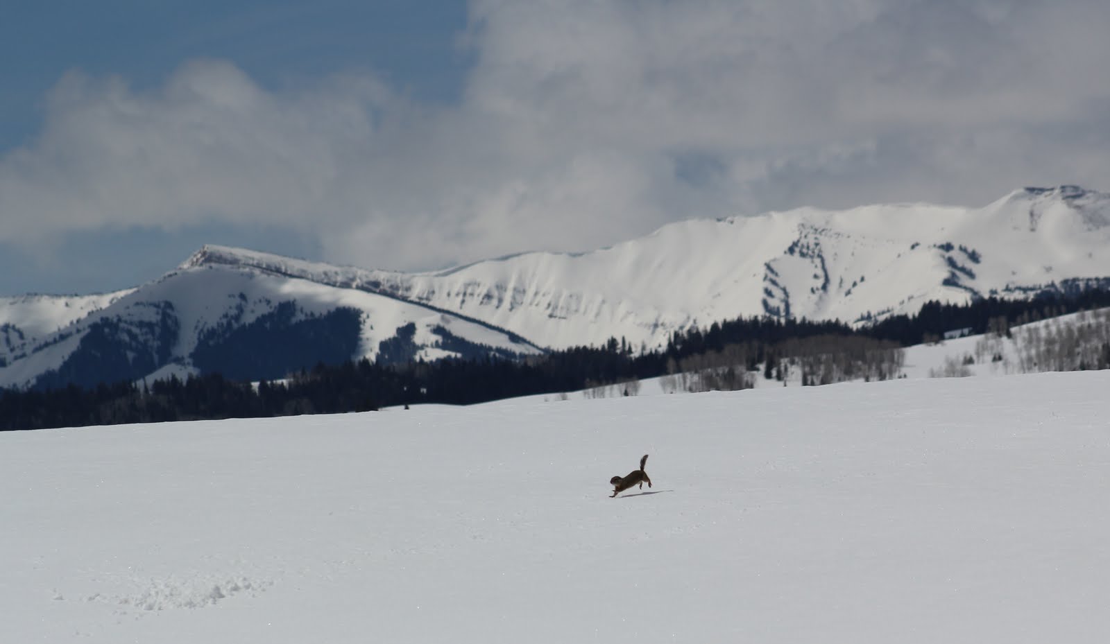 A little further north, near Bondurant, the snow is still very deep, but even small animals came out of their burrows to enjoy the sunshine, racing back and forth with glee.