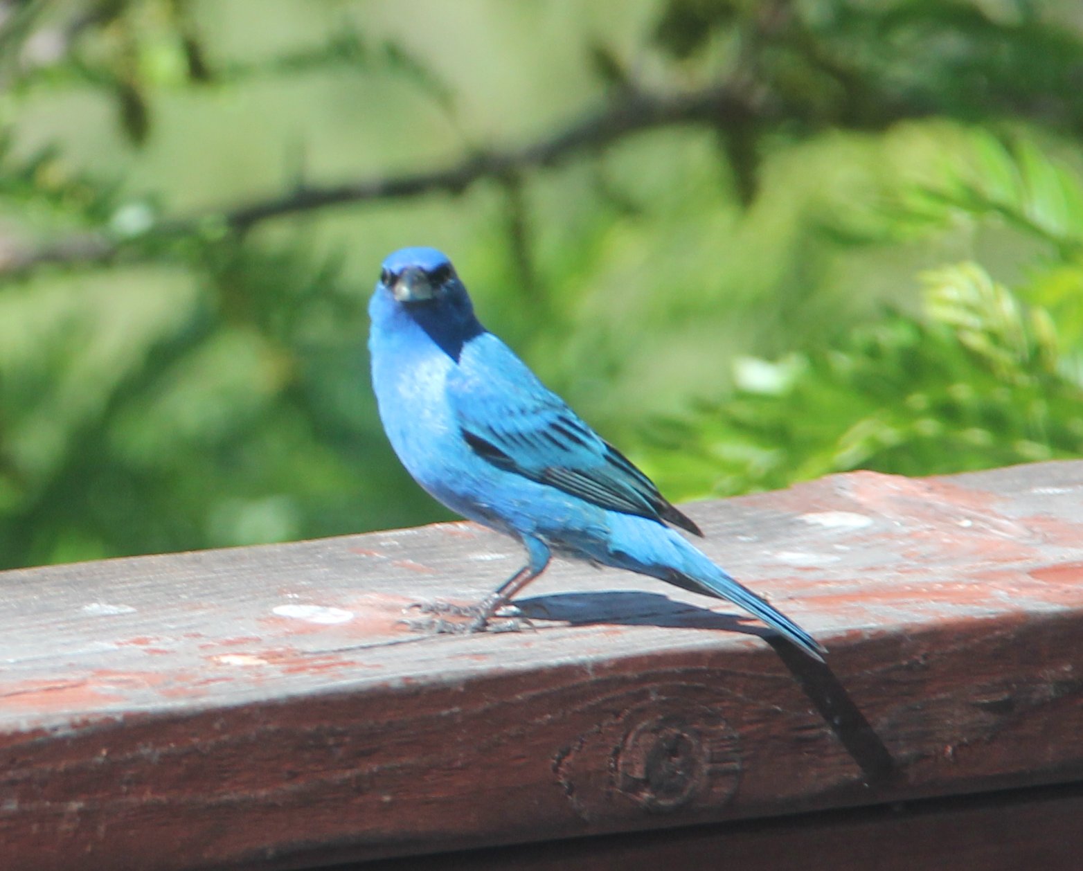 Like the blue jays I posted about last fall, the indigo bunting is a bird I remember seeing when I was growing up in Tennessee that I didn’t expect to see out here at the western edge of its range. The two species seem to be coming in to our feeders in mixed flocks. After doing a little checking I have seen that these species sometimes hybridize out here where their ranges overlap. I have seen one individual (no pic, alas) that is likely a hybrid – he looks just like the indigo bunting, but has a white breast.