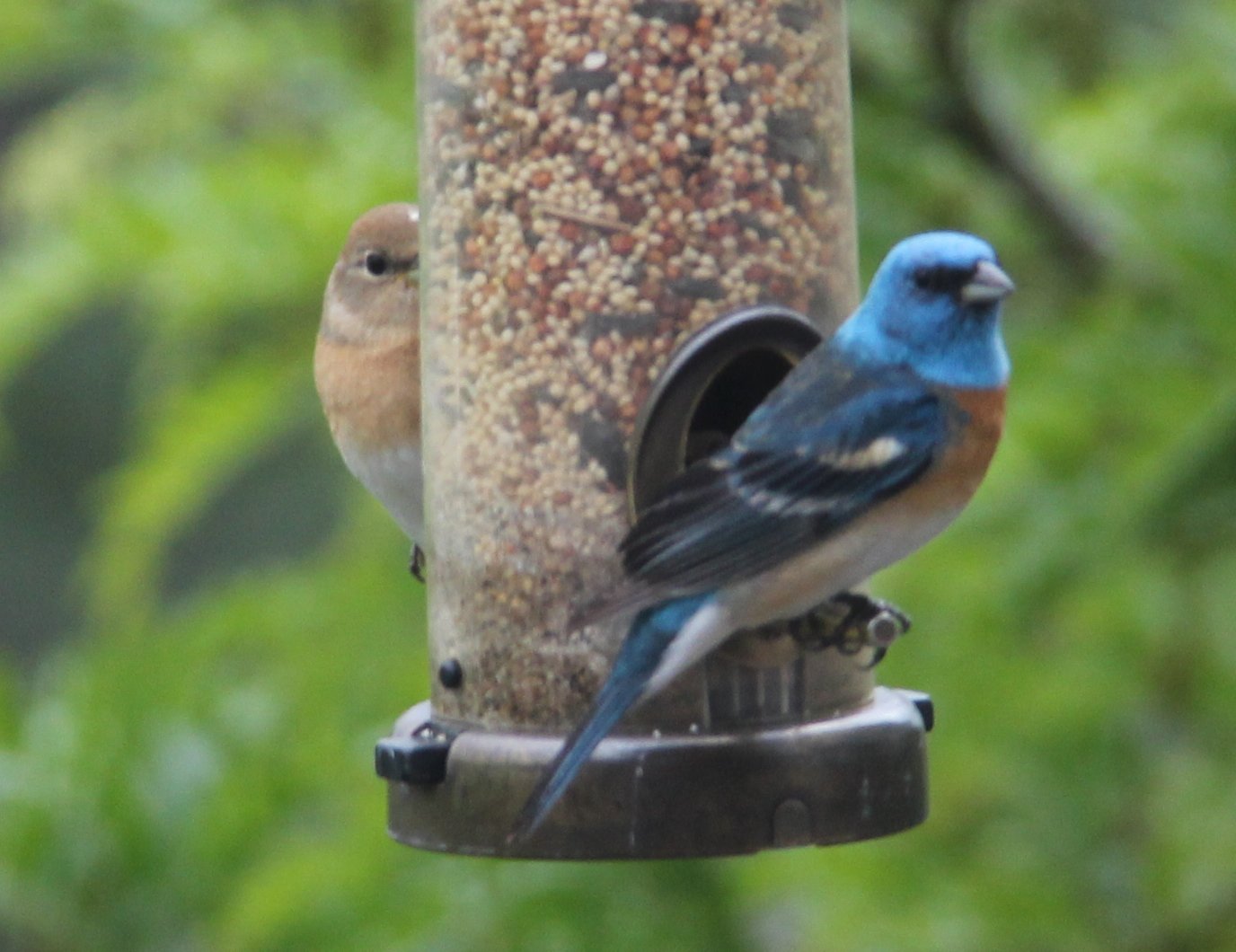Oh, in the top picture, that's shy Mrs. Lazuli Bunting hiding behind the feeder.