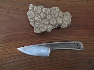 I responded in email: “Here is my equivalent, my favorite “good” knife. This one is a using- grade custom, a David Boyes/ Francine etching minimalist job I have had for years, since reading a review of a similar one by Stewart Brand. It is pretty but utterly utilitarian. So far I have never needed more handle though you could retrofit one. It has a nylon two way belt sheath with a copper liner, 3″ blade, and is 6 1/2 overall.