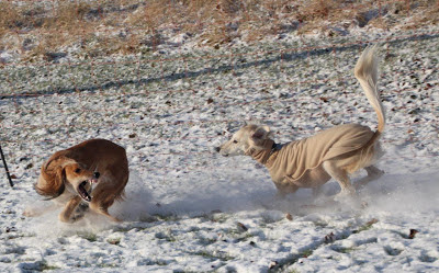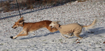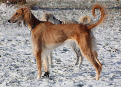 Well, at least one of these salukoids has some clothes on in this photo!….L.B.