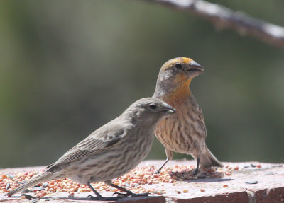 We have a bunch of house finches at work–they build nests in overhead light fixtures under the eaves on the south patio. They're very entertaining. The females sometimes flutter their wings and chirp and chatter at the males, who eventually 'kiss' or feed the females. I assume this is mating behavior?