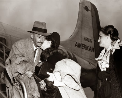 I just stumbled across this earlier today. The Memphis Commercial Appeal runs a rotating gallery of historic photos from its files. This one from December 1950, shows William Faulkner and his daughter Jill saying good-bye to wife and mother Estelle at the Memphis Airport. They were boarding a plane to begin their journey to Stockholm where Faulkner accepted the Nobel Prize for Literature.