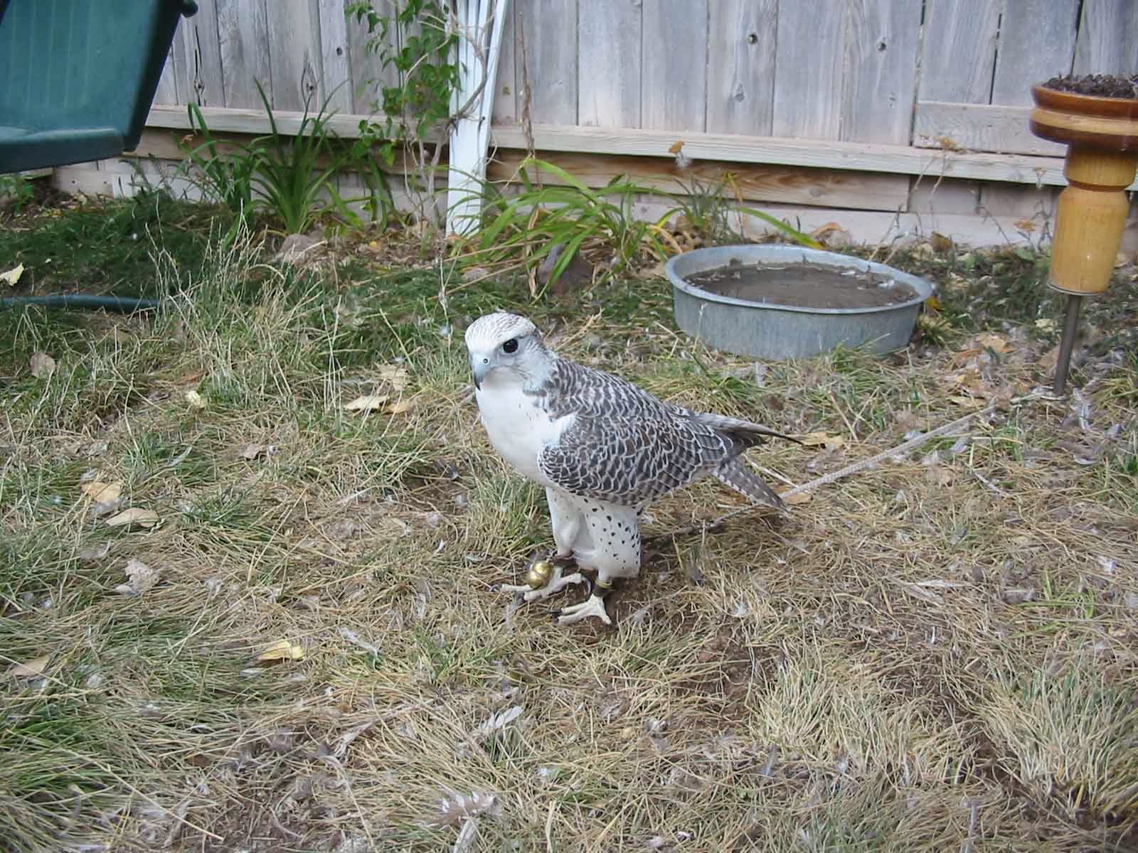 Pure Gyrs used to die easily of diseases, especially stress- induced aspergillosis. (A friend used to say they were all “born with AIDS”). That ever- present fungus is better understood these days, and I might not have lost the gray bird above to it if we had known what we know now. A bit of Saker or Prairie or Peregrine genes is damn near a cure.