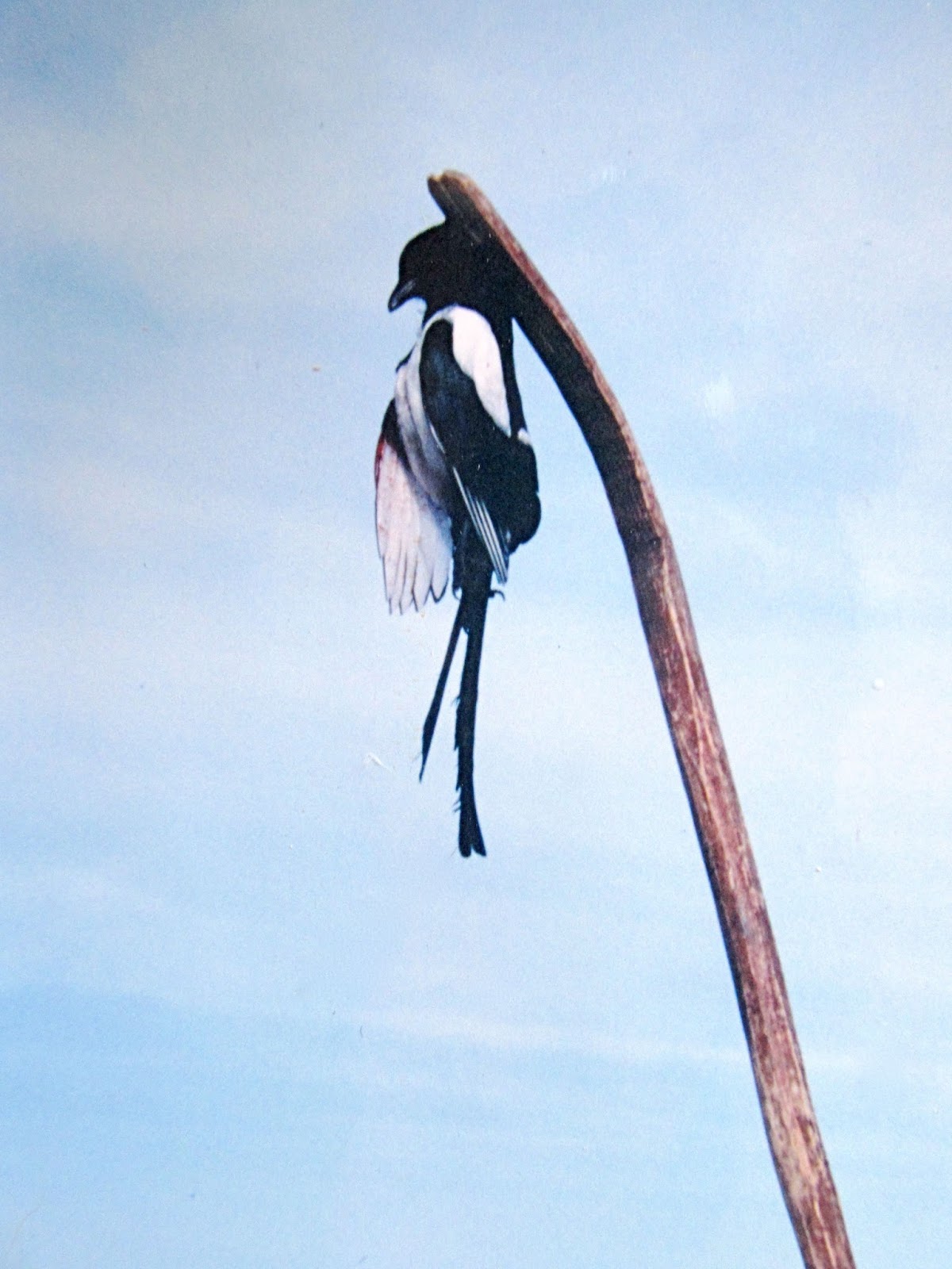 What the hell, a few more; this post has become pure free association anyway: Siassi and me and Canat, young and strong and invincible in late February ’97; my first hunting paty in Mongolia, pure Indiana Jones; and a scare- Magpie hung over Aralbai’s lambing corral, showing that intelligent corvids are not the herder’s friends. Jackson used to have an Irish- sounding reel he had written called “The Magpie’s Breakfst”; when asked what a Magpie’s breakfast was, he would answer succinctly, “Roadkill!” And Pere Henri Michel, the naturalist priest in Serignan, home of Jean- Henri Fabre, would shake his head over the sheer numbers of Magpies there, which kept the numbers of song and game birds depressed, and say “Les pies sont mechant; ils ne sont pas baptisee!”