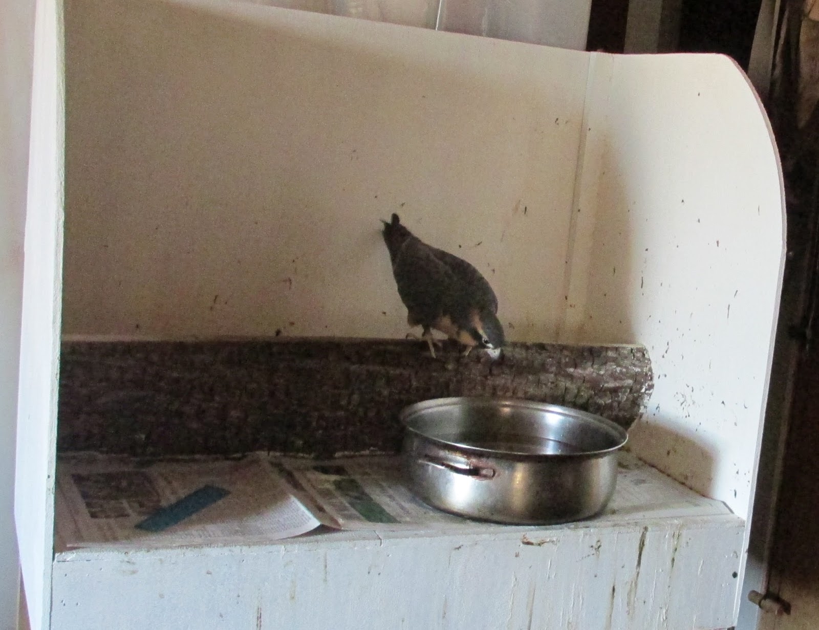 Silliest and most engaging hawk we have ever had. Courts Libby continually. She is making a nest of shredded Wall St Journals behind her perch, which she tres to lure Libby into. Bathes in a cooking pot…