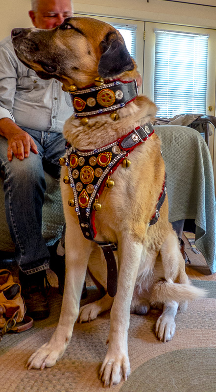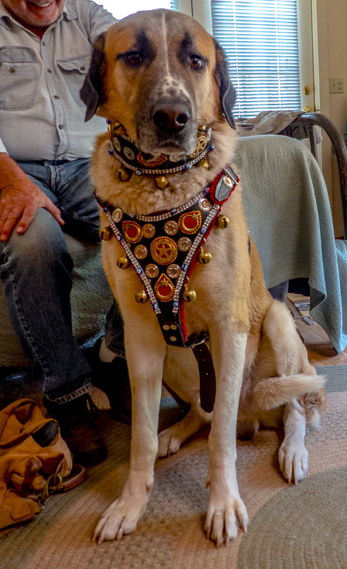 It's BEAUTIFUL dog regalia, for sure, but I can understand the less-than-enthusiastic look on his face. As a Livestock Protection Dog, it's kinda hard for any wolves or coyotes(much less bears or cougars) to take him seriously in that get-up!…..L.B.