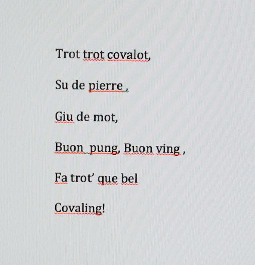 Language? Does your culture have a “Trotting Rhyme”– that is, one to the recitation of which you bounce your kid o your knee? We had TWO. One was “Trot trot to Boston..”; the other, reconstructed on the Internet by sound, was this. They SAY it’s Italian, but what does it sound like to your ears?