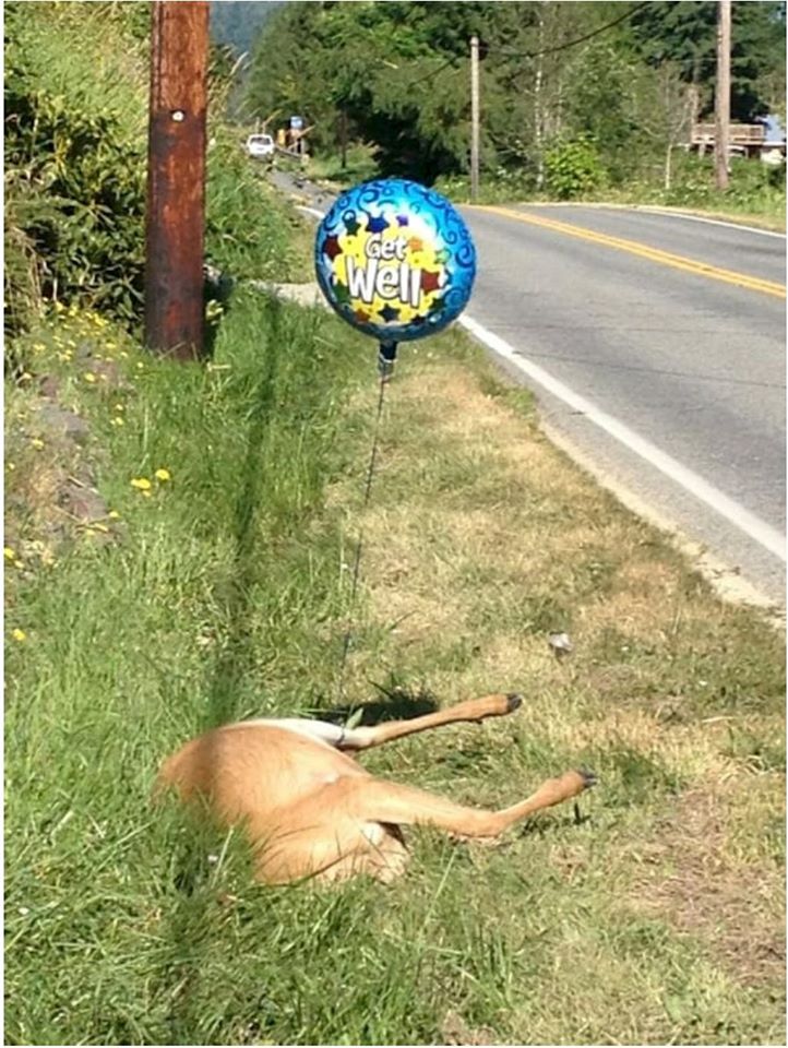 But John- it is a WHITE TAILED DEER, not a dog– and it is dead,and the sign says 'get well'.