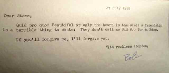 “Bad Bob is the Blood MASTER!” said then girlfriend and Canadian literary critic Elaine Duffy- and that after Bob had thrown us out of his car at 2 AM in a sudden fury, after drinking the night away with Annie Proulx in her half- finished house, leaving us to walk five miles drunk at 3 AM and talk our way into a motel… I forgave him easily when I found this note waiting for me in New Mexico:
