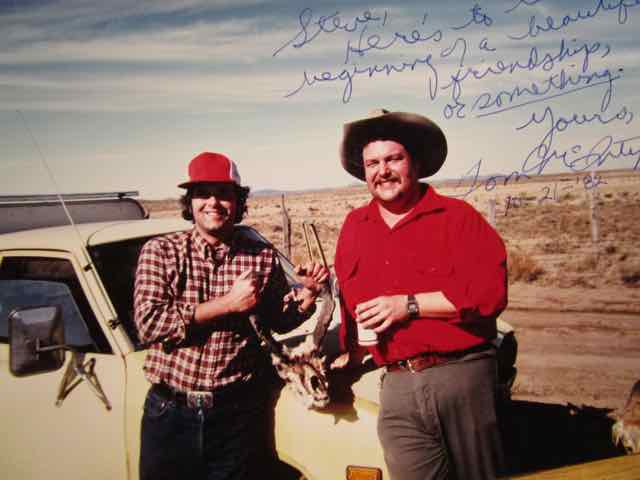 There were other oddballs of talent around; like the Bozeman poet Greg Keeler, author of “Is the ouzel stupid?”, the Montana poet turned rifle maven John Barsness; the often baroque but always elegant, hyperliterate young Los Angeles stylist Tommy McIntyre, whose 21st birthday present was, I think, the last safari in Kenya… First photo SB & TM with found antelope head, near the Lightning Field in Catron County NM ca 1984, which led directly to a Sports Afield piece that began “They wouldn’t let us run the hounds in the art installation.”