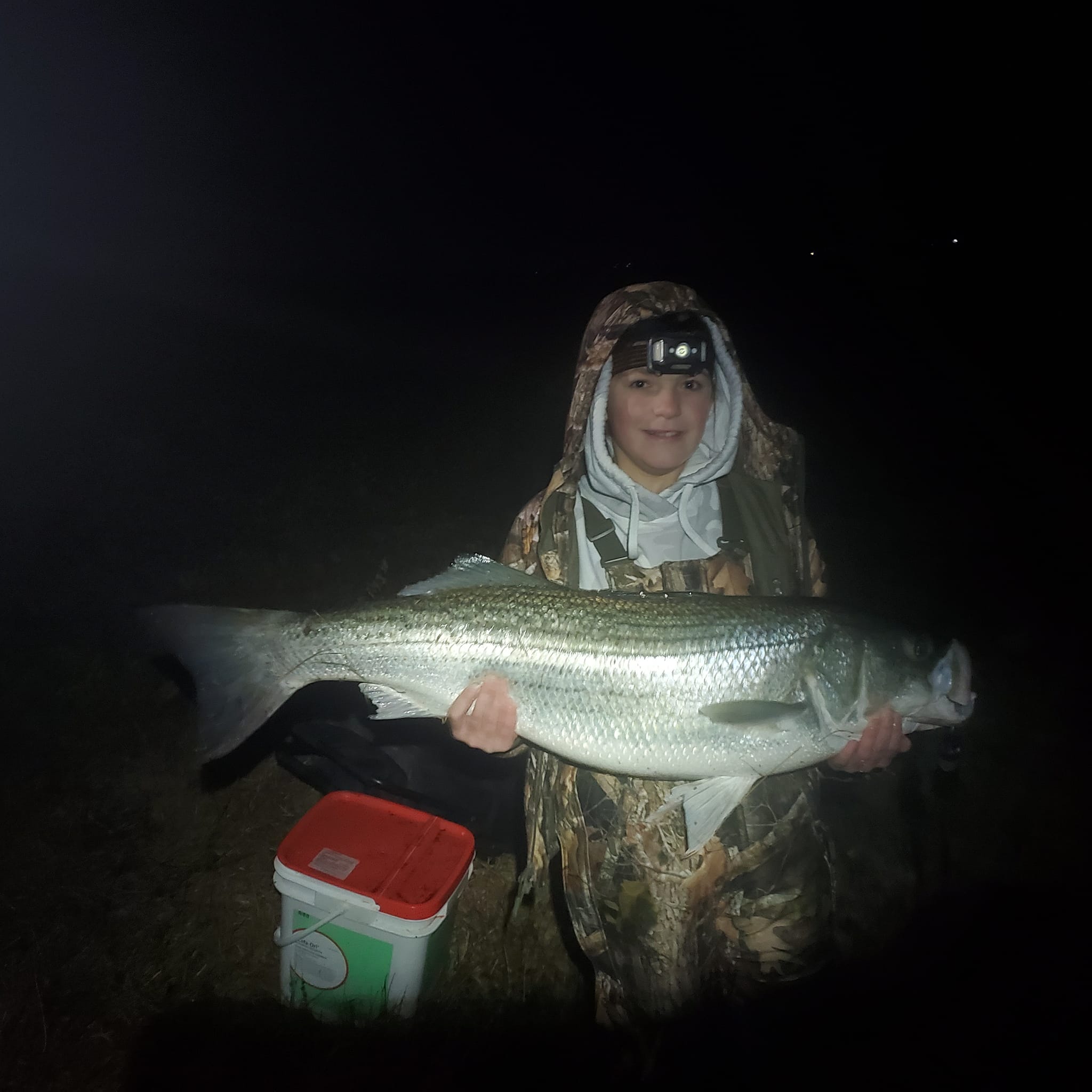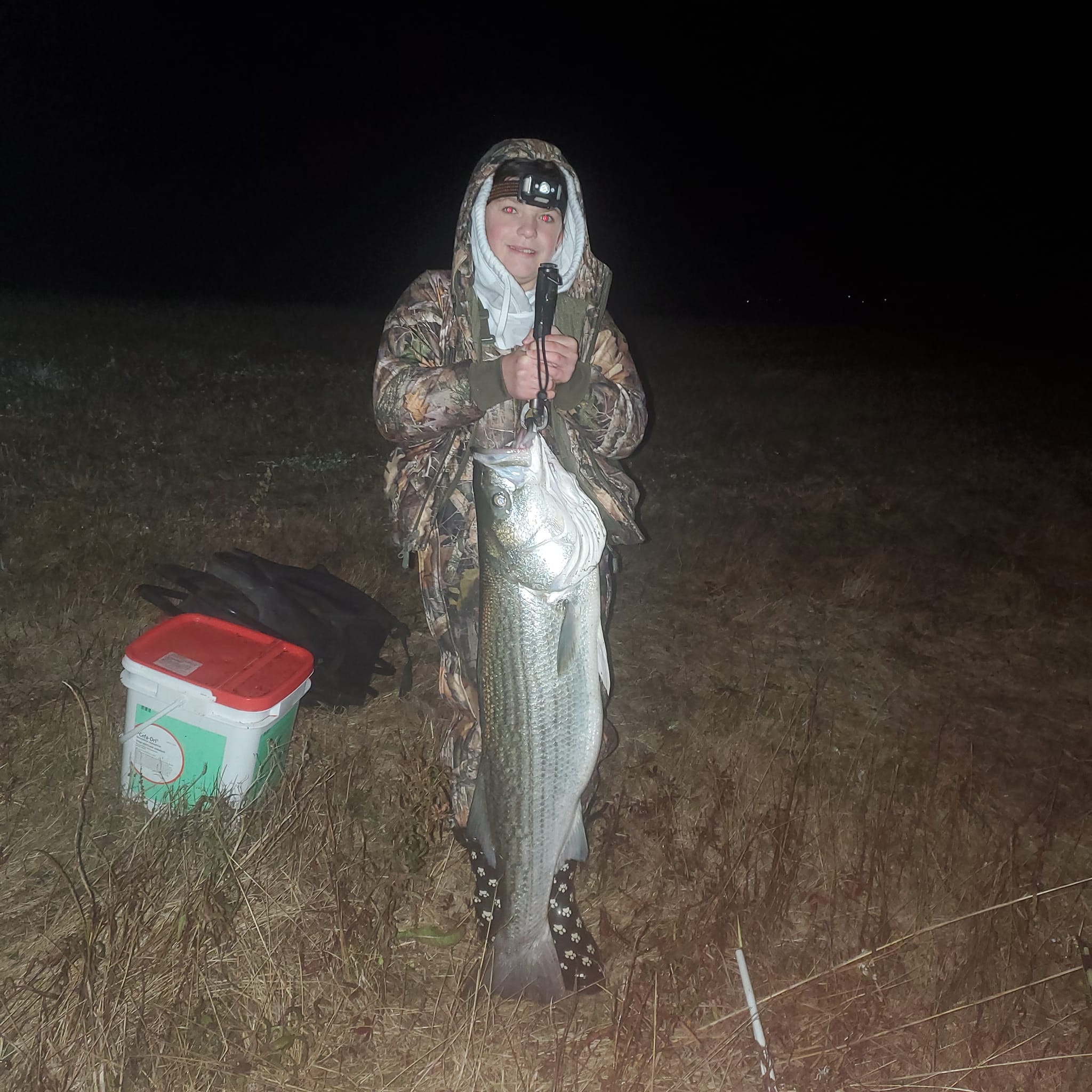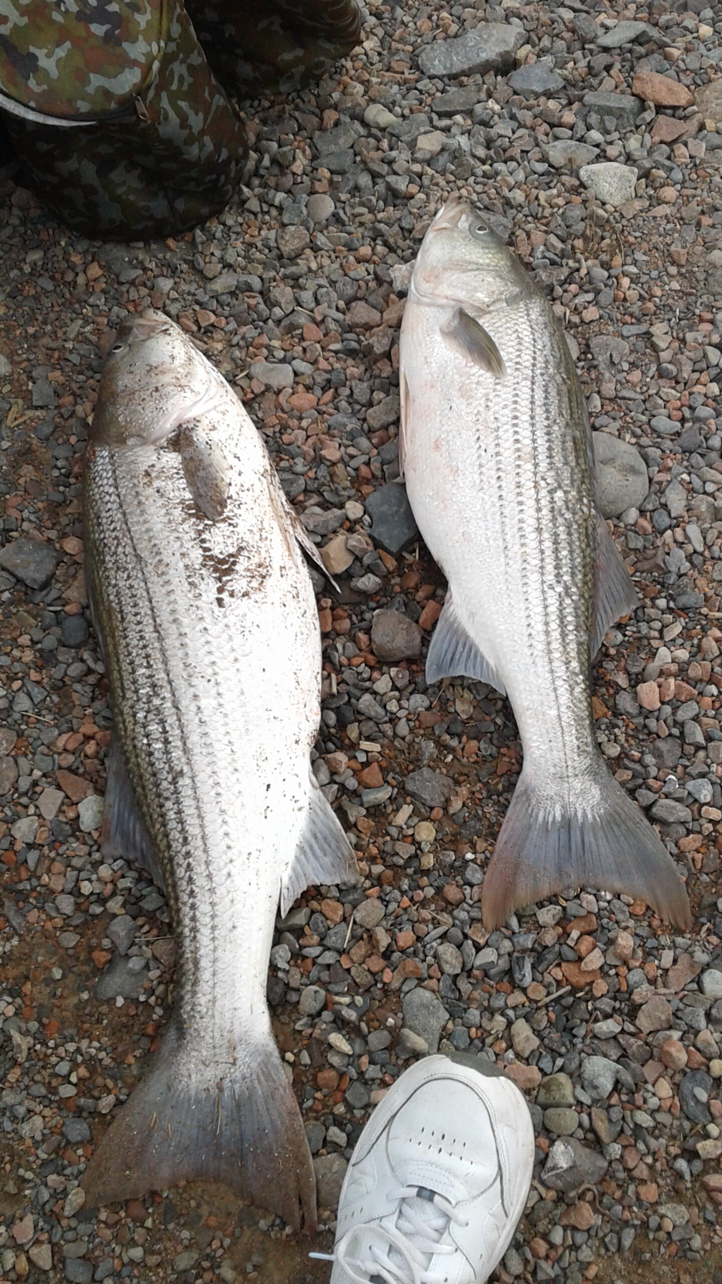 The rip in front of my brothers cottage, just 2 years ago. When the tide is running out against the wind these rips can form. I was surprised at how dramatic it can be. There can be 20 people fishing there which isn’t my preference. That, and the muddy water you can’t see an inch in, never appealed to much to me after MA. Before we left, a guy brought up the two nice ones in the 30 to 35 inch class.