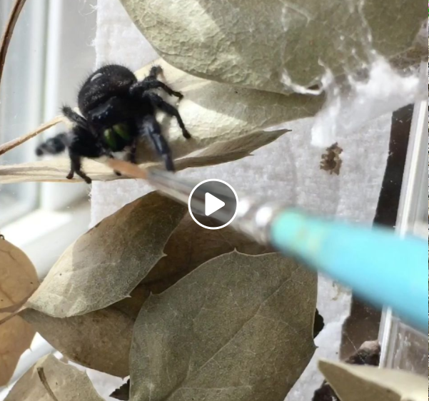 On Tuesday I said goodbye to my old lady, Little Miss. I found her in our barn back in early June, she could hardly move and she was covered with dust. I brought her inside and gave her a mixture of honey water, which gave her much needed energy. She was already elderly, so I did my best to give her a good life, and I think she had just what any jumping spider could dream of. A nice cozy home, a sunny window to bask, plenty of food and water. I got pretty attached to her! Only last week I took a nap on my bed with sun shining into my room, and Little Miss wandered around a bit on my sweater, and made herself cozy in a nice sunny spot. We had a nice nap. She had gotten to the point where she did not want to crawl off of my hand back into her terrarium, so I made it so that last week was a special one. She spent her last day on the top of her oak leaf, her favourite sunbasking spot.I write all this out too, because many people are afraid of spiders. I’m happy that I gave this spider a good life, and there is a certain joy in caring for elderly spiders. I hope this, and the video of Little Miss reaching for her honey water treat helps someone love spiders a little more.
