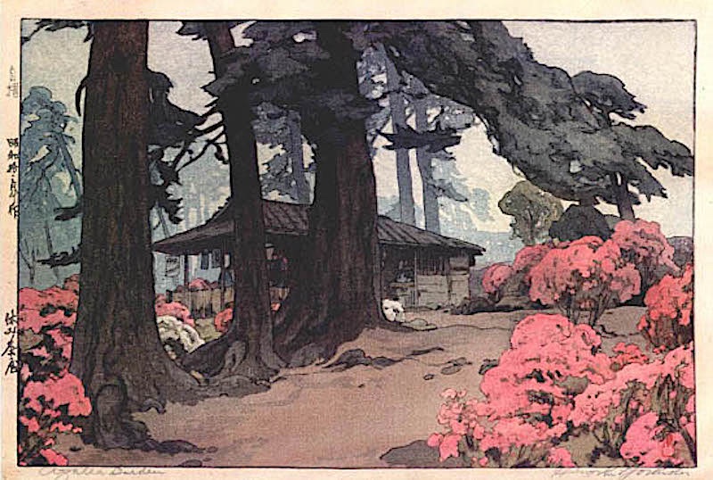 “Azalea Garden (Teahouse)”, 1938, by Yoshida Hiroshi (吉田 博, 1876–1950), a 20th-century landscape painter and woodblock printmaker who is regarded as one of the greatest Japanese artists of the shin-hanga (新版画, new prints) style.