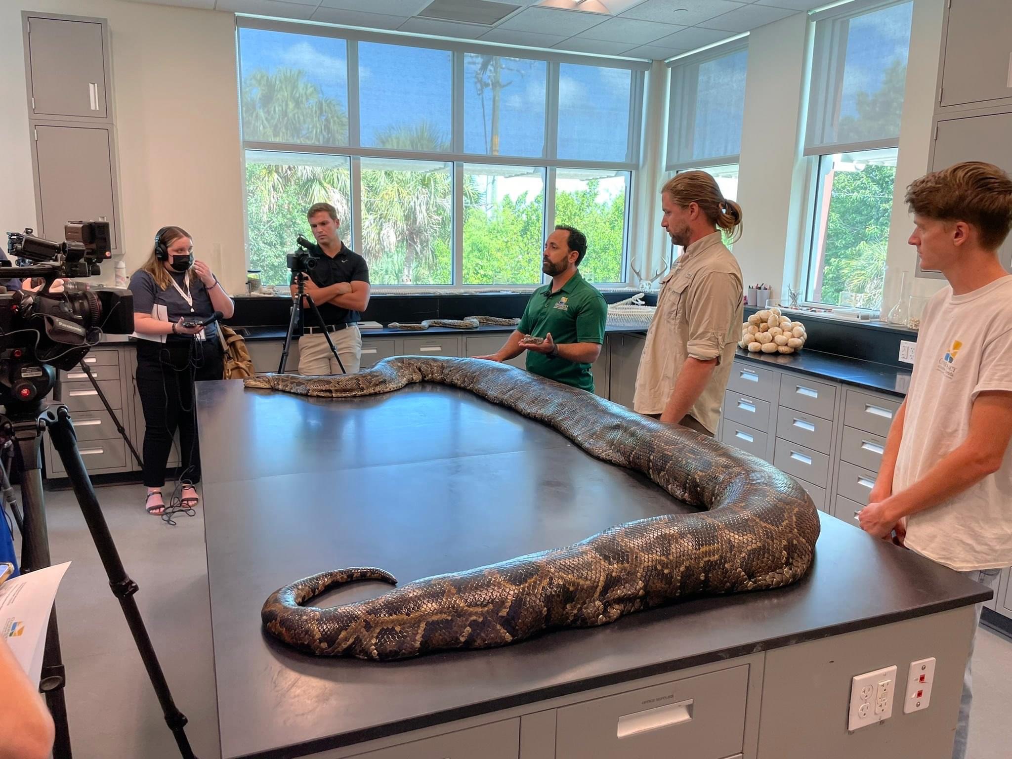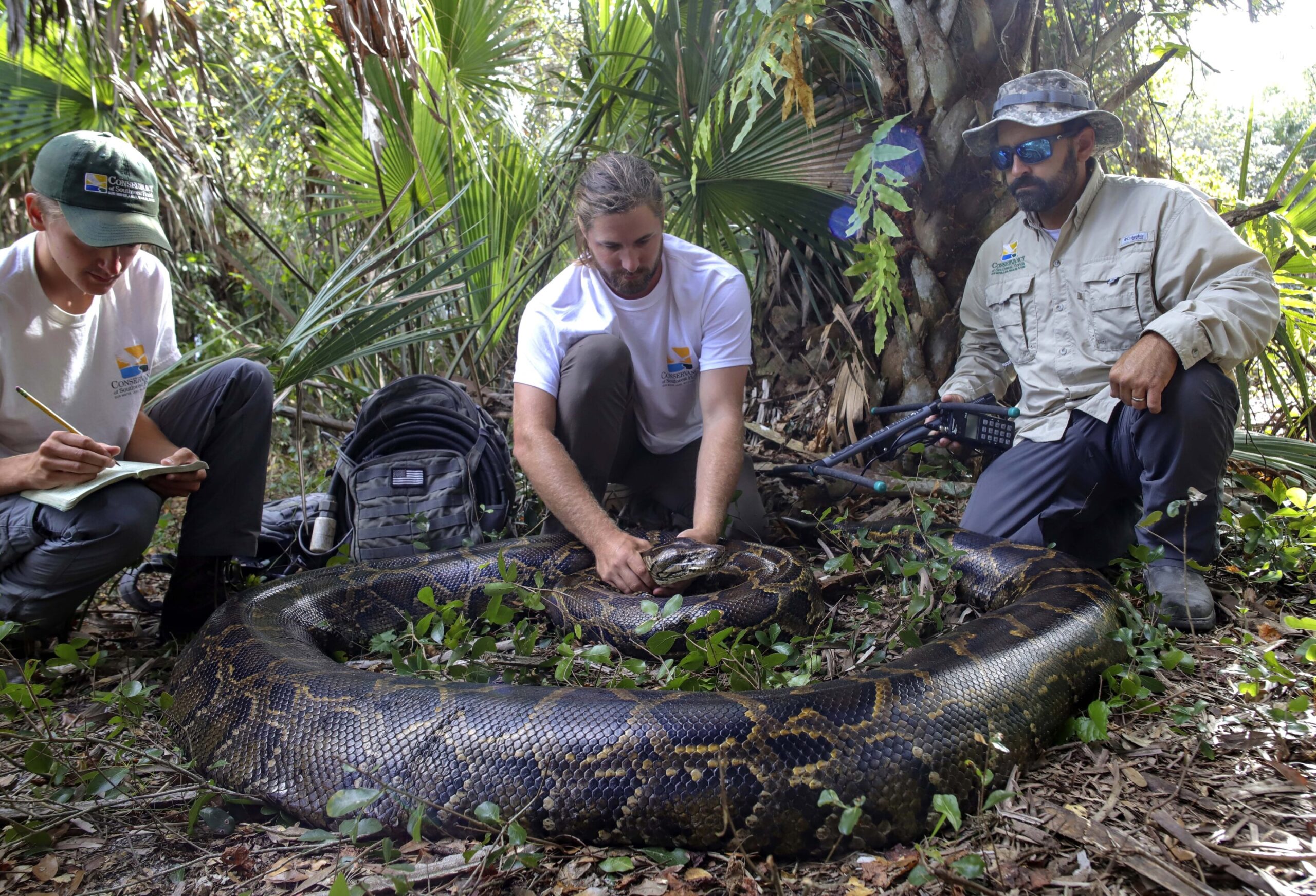 The female python weighed in at 215 pounds (98 kilograms), was nearly 18 feet long (5 meters) and had 122 developing eggs.