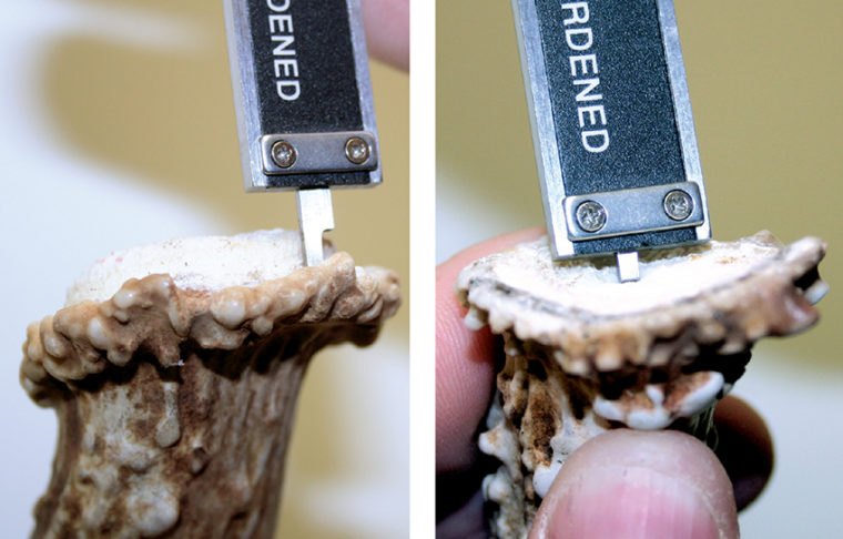 Researchers measured seal depth by using the “depth rod” of a digital caliper. With “healthy” sheds (left), seal depth is measured to the highest point on “convex” seals. For “unhealthy” sheds with concave seals that are recessed or hollowed out (right), the caliper blade is placed in the deepest point of the seal and measured to the highest point. This produces a negative seal depth measurement. It’s a good sign if most of the sheds you find each year look like the shed on the left, with a convex or protruding seal.