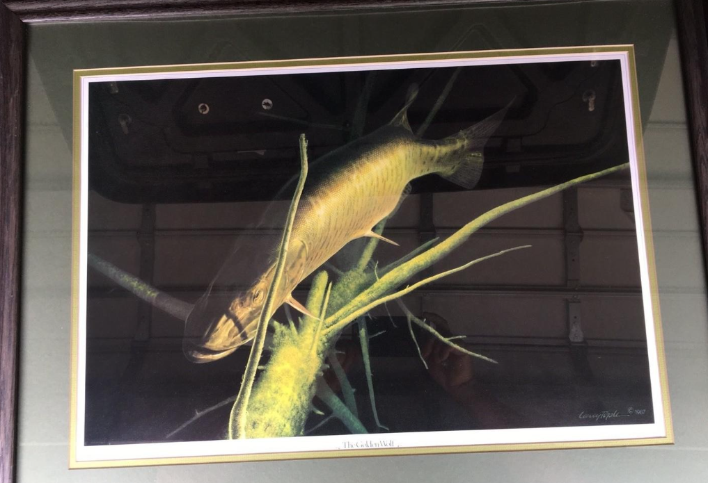 *I love images of muskies and muskie fishing but I seldom see a good one. Maybe the market is too small. The one above by Larry Tople is the best one I remember for getting the gist of a muskie. I like how it is on the border of light and dark where a muskie might linger. The drowned tree accents the association with cover. You can feel the brooding intensity of a predator coiled for action. It has the tropes of a fairy tale monster and for smaller fish it would be. There was another image that was also good but I couldn’t find it.