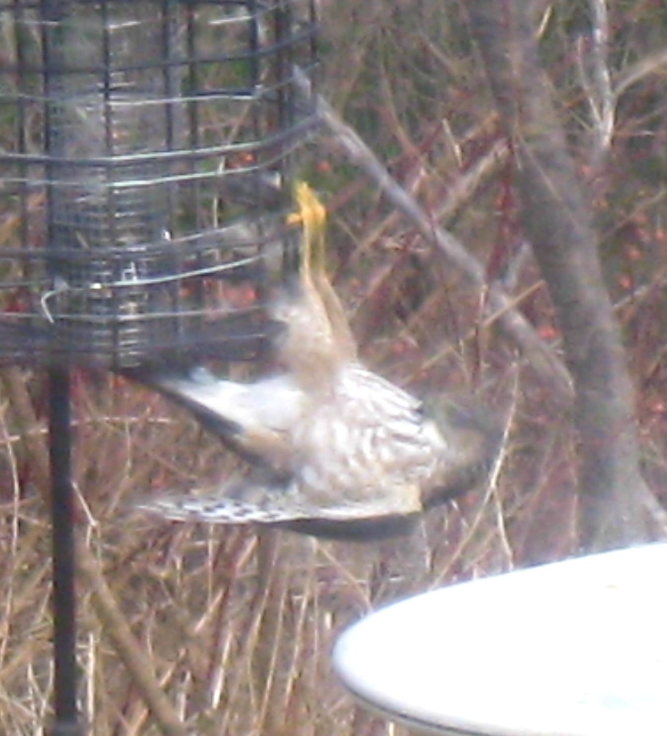 Local Goof A sharp shinned hawk with good timing trapping a chickadee inside a feeder. Took several minutes but the hawk won. Bruce Doucette