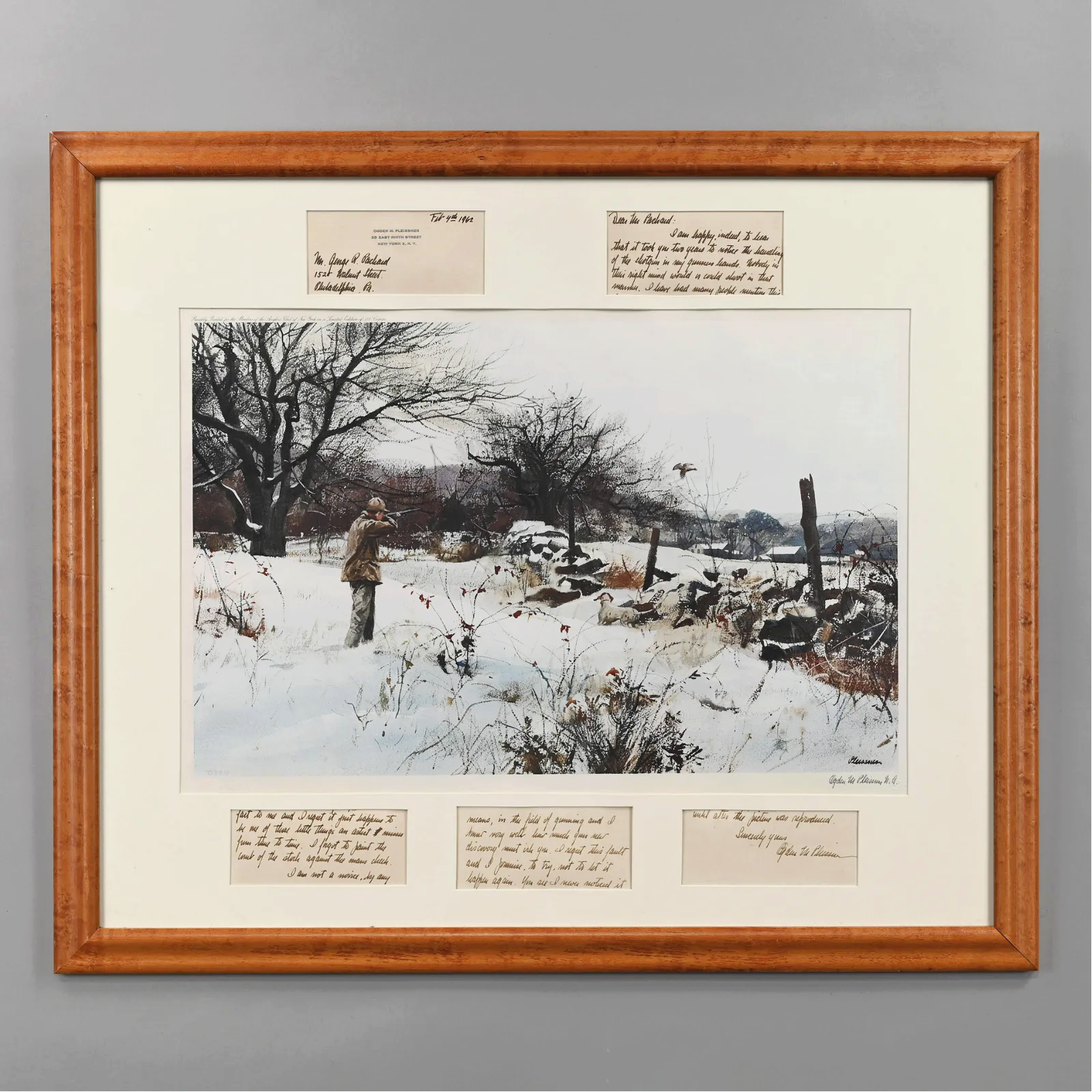 Ogden Minton Pleissner (American, 1905-1983). “October Snow,” 1959. Framed with a Letter Written to George R. Packard. Color lithograph, signed in the print “Pleissner” lower right, and signed “Ogden M Pleissner N.A.” in pencil beneath, (15.875 x 23.75 inches, sight), privately published and copyrighted for the members of the Anglers’ Club of New York in a limited edition of 350, with a portion of the stamp lower right.Frame: H: 27.375 in., W: 32.25 in., D: .75 in.The letter cut in sections and written on Pleissner‘s letterhead, addressed to George R. Packard, 152 Walnut Street, Philadelphia, PA., and dated Feb. 4th, 1962. It reads:”Dear Mr. Packard: I am happy, indeed, to hear, that it took you two years to notice the handling of the shotgun in my gunner’s hands. Nobody in their right mind would or could shoot in that manner. I have had many people mention this fact to me and I regret it just happens to be one of those little things an artist misses from time to time. I forgot to paint the comb of the stock against the man’s cheek. I am not a novice, by any means, in the field of gunning and I know very well how much your new discovery meant to you. I regret this fault and I promise to try, not to let it happen again. You see I never noticed it until after the picture was reproduced. Sincerely yours, Ogden M Pleissner“. Liveauctioneers