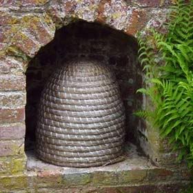 Before the introduction of modern beehives the straw shelters were often placed within a wall for the summer. I am not sure how the honey was gathered, perhaps someone could explain.