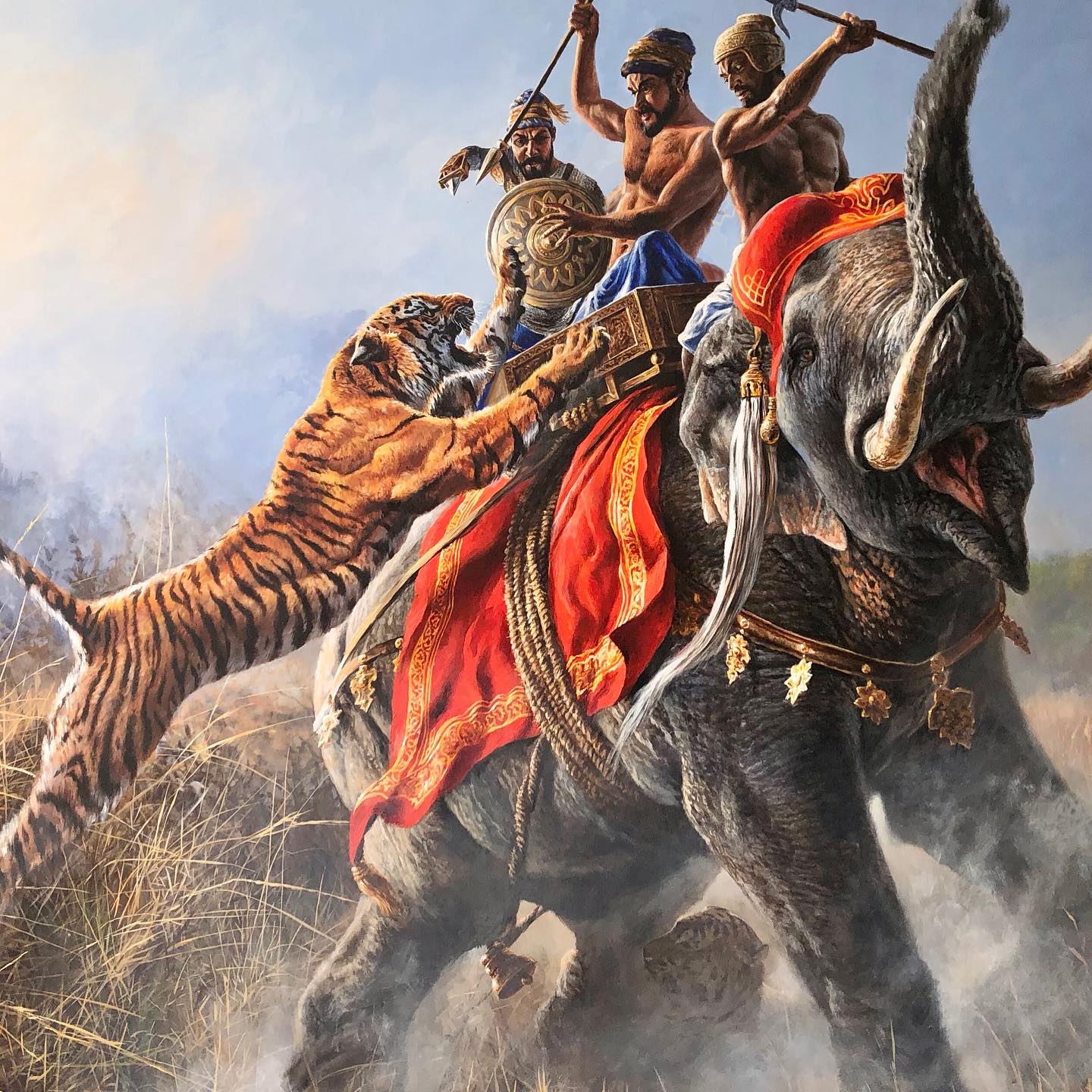 Drama in the Indian Forests and Grasslands, a painting interpretation of a bronze sculpture by Antoine-Louis Barye. I was asked to take inspiration from the sculpture that Barye produced in 1840 for a client. The Mughal empire stretched from the outer fringes of the Indus River Basin in the west, to northern Afghanistan in the northwest, and Kashmir in the north, to the highlands of present-day Assam and Bangladesh in the east, probably at its height in the 17th century the Mughal empire was vast and powerful. In the scene, a tigress attacks the men atop an Asian elephant. Part of a routine patrol the men stumble upon her and her nearly full grown daughter, a violent altercation ensues. A moment lost in history. Hopefully, I’ve brought the intensity of the moment to the viewer. Andrew Ellis Artist