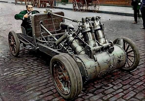 THE BRUTAL AMERICAN 20-LITRE V-4 FRONT WHEEL DRIVE CHRISTIE RACING CAR OF 1907The most spectacular and brutal car Christie ever built was definitely the V-4 racer of 1907. It had an engine that housed an astonishing 20 liters (1,214 cubic inches), mounted transversely, the crankshaft taking the place of the front axle! It was a completely new design, specially built for the 1907 racing season and using no parts from previous racers. The immense engine had a bore and stroke of 184 x 184 mm (7 1/4 inch square) and 8 atmospheric inlet valves per cylinder and just one mechanically opened overhead exhaust valve. The transverse mounted engine employed crankshaft mounted spur gears and telescopic U-joints on each end to drive the front wheels, originally through a transmission arrangement that featured dangerously exposed gears. Later this was changed, to make it better suited for high-speed racing.