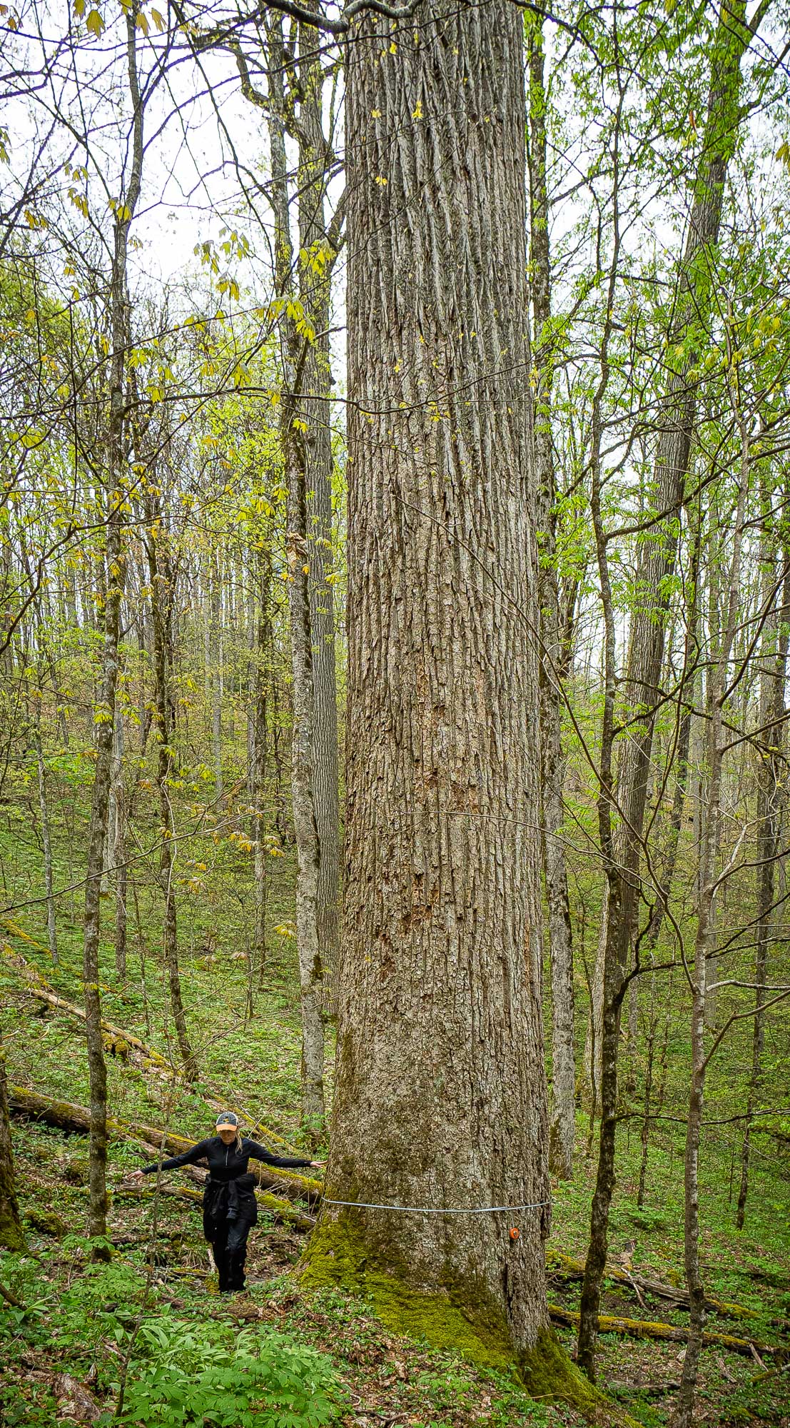 Once we reached the Tulip in its well-hidden cove after a bit of a bushwack off-trail, I was pleased to find that a marker pin was still affixed to the trunk, allowing remeasurement without any guesswork at the previously determined DBH level. High up the slope, with my 200x mounted on the tripod and triggered by bluetooth, I was able to be confident in making the best measurement I could make from the ground-