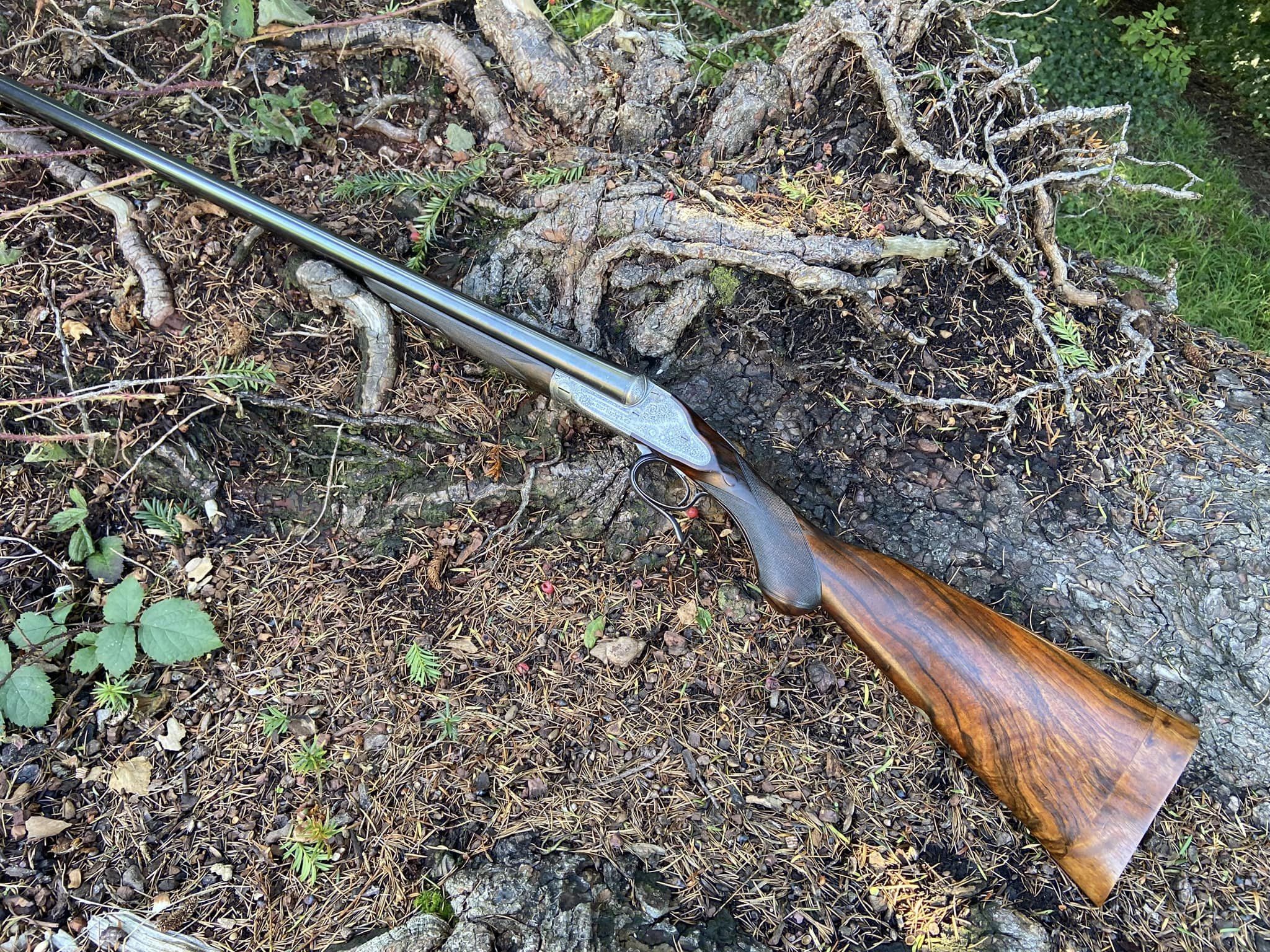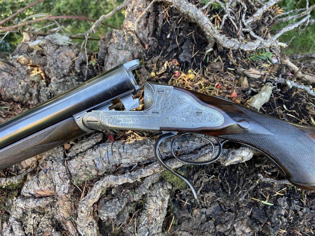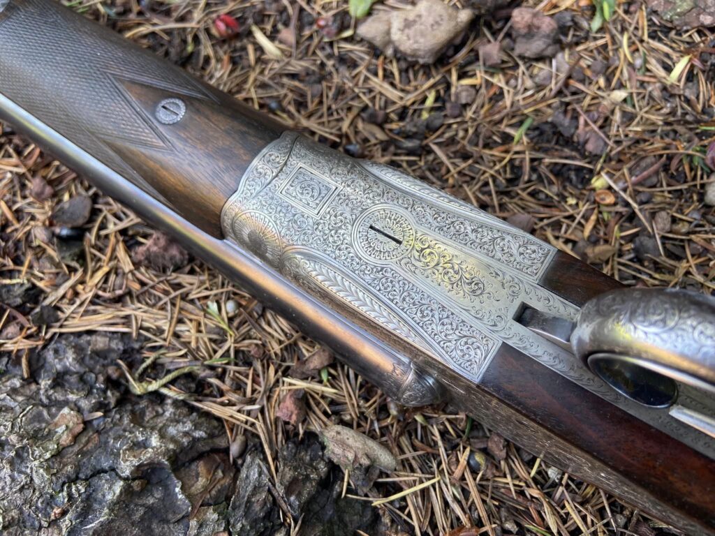 Rigby snap under lever 12 bore with vertical bolt. Early 1890s. The odd comb shape is original according to records. Vintage Guns