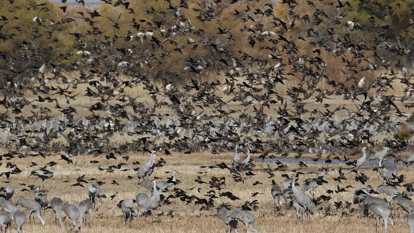 Red-winged black bird murmurations above the sandhill cranes, snow geese and ducks