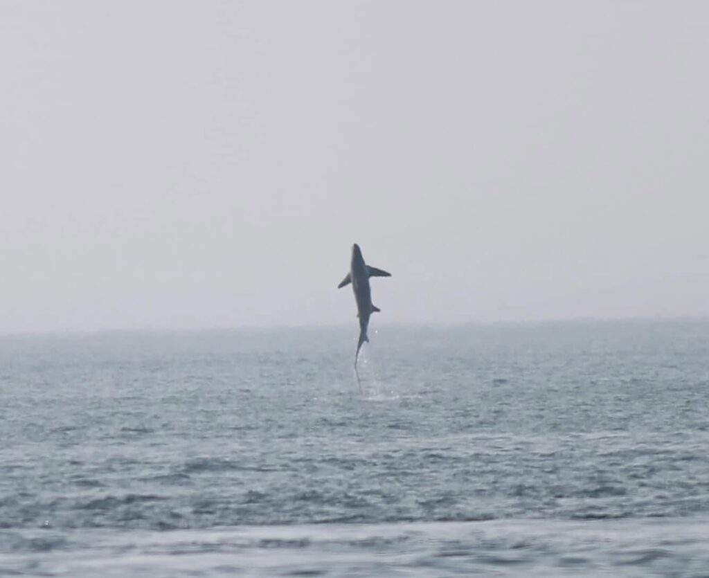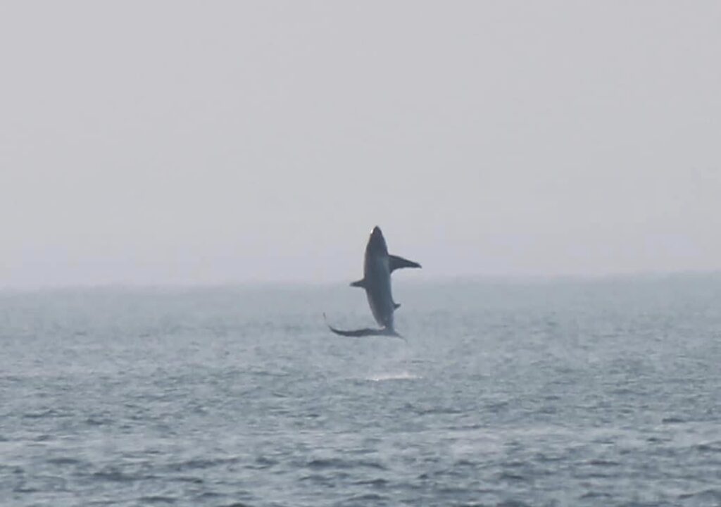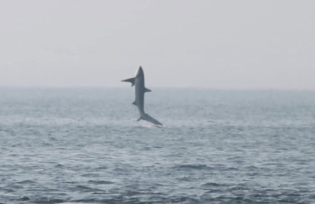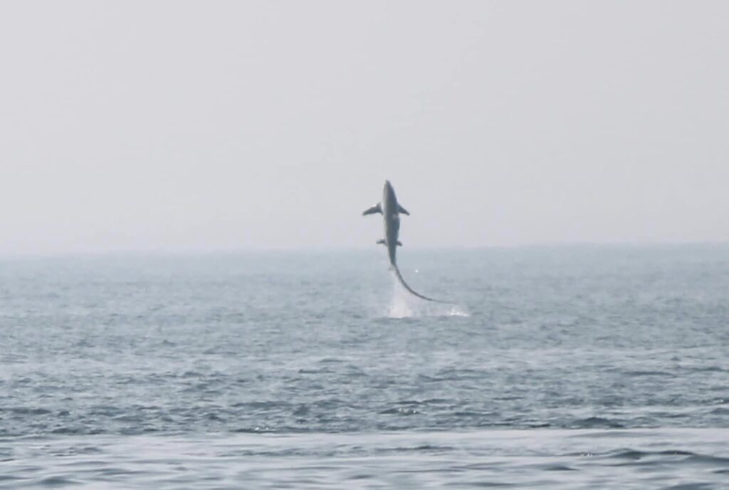 What a day on the porgie today! The day was warm and calm and the fog was patchy. We had great trips in the morning and afternoon. Saw humpbacks lunging and feeding. But the best trip of the day was the 5:00 trip. We had just came around northern light to begin our trip and saw a splash not far away. I grabbed my camera and started snapping and got great shots of a thresher shark breaching! Nearly every day people ask me if we see sharks, I always answer, very rarely. Sharks don’t have to come to the surface to breathe so we rarely see them, besides the basking shark, who is a filter feeder and feeds on the same things as the humpbacks and is sometimes spotted near them. So we were very excited to see this thresher today. Right place at the right time. The trip was ended with a beautiful humpback slapping his great fins. It was a great day and we are hoping tomorrow will be just as great.
