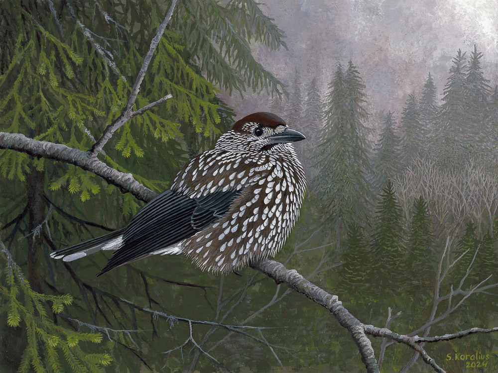 One of my latest paintings depicting a Nutcracker (Nucifraga caryocatactes) in its beloved habitat. This bird prefer dark old spruce forests. Acrylic on paper, 24 X 30 cm Saulius Karalius