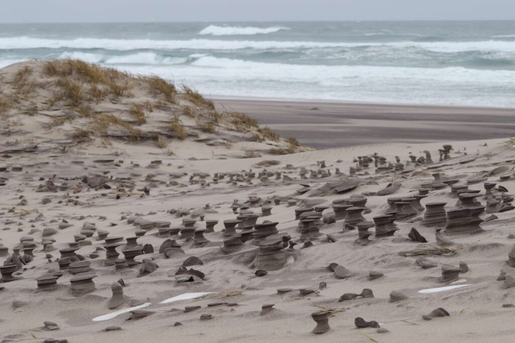 These mini hoodoos form on Sable Island when wet sand freezes, then strong winds erode away the drier sand.