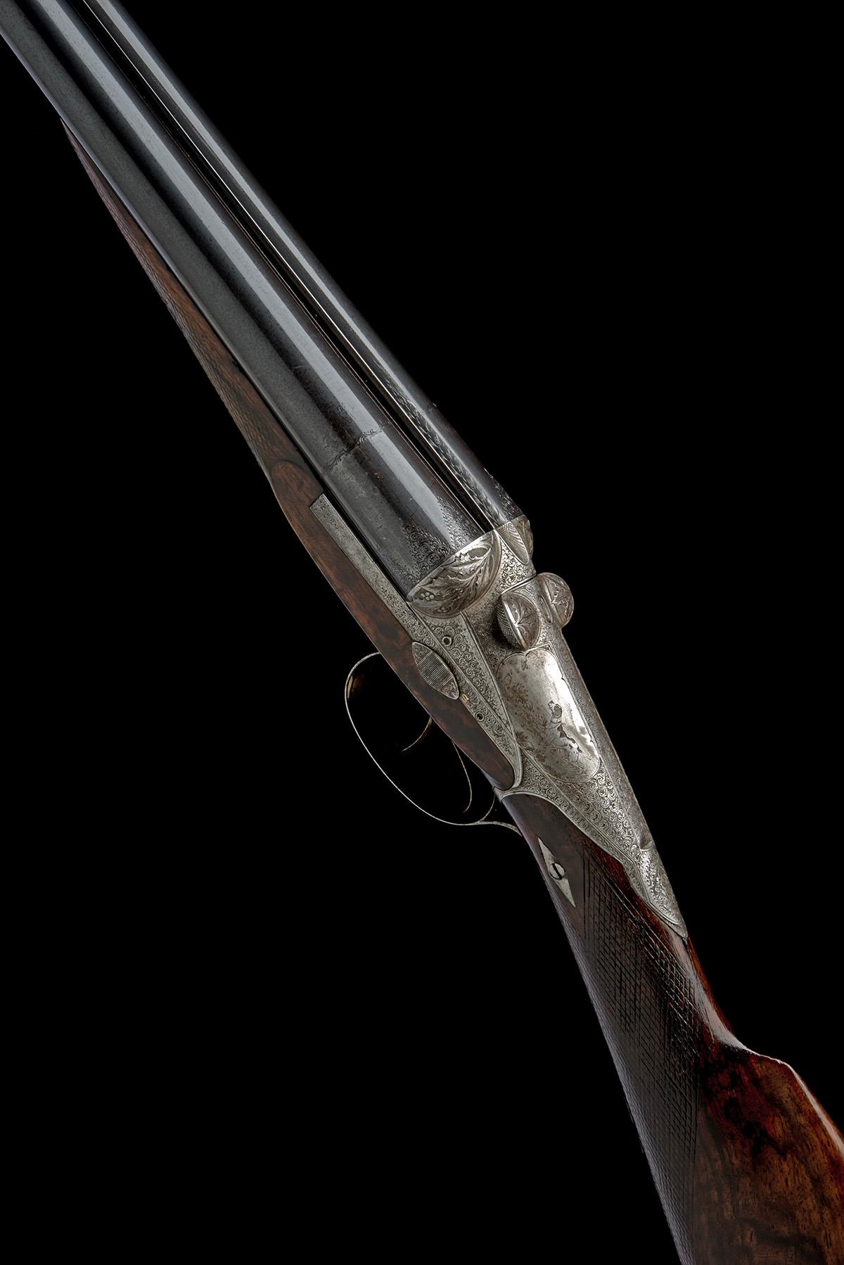 circa 1905, 29 1/2in. smokeless proof monobloc barrels with sunken matt top rib and no under rib, scroll engraving at the breech end, 9 punch marks, 2 5/8in. chambers, bored approx. 1/2 and 3/4 choke, sprung sliding-breech with converging obturator discs, button barrel release, manual side safety with gold-inlaid ‘F’ and ‘S’ details, fine acanthus scroll engraving surrounding game scene vignettes of hound and fowl, the fences carved in high relief with holly leaves and berries, the underside with a gold-inlaid monogram ‘ED’, 15 1/4in. figured stock including 1 1/2in. wooden extension and with later diamond-shaped strengthening plates at the hand, fore-part with horn finial, weight 7lb. 7oz.