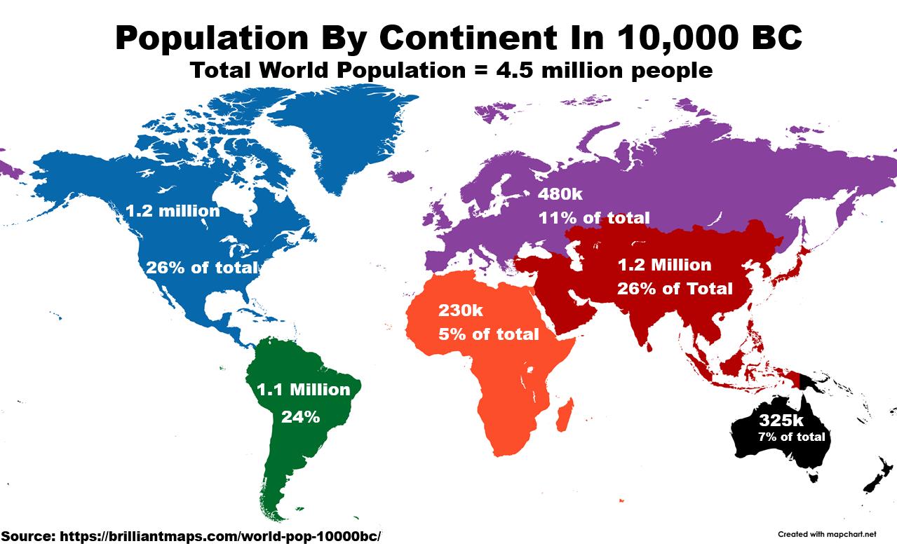 The map above shows a very rough estimate of the population of each continent in 10,000 BC.