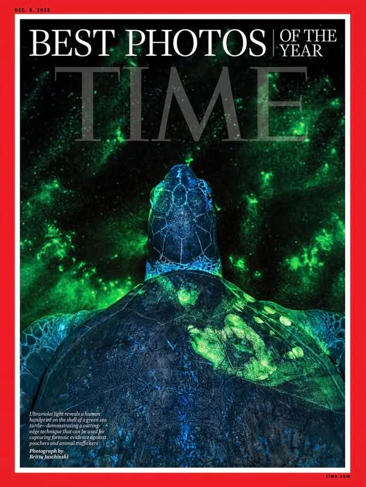 Ultraviolet lights reveals a human handprint on the shell of a green sea turtle, demonstrating a cutting edge technique that can be used for capturing forensic evidence against poachers and animal traffickers. Photo by Britta Jaschinski